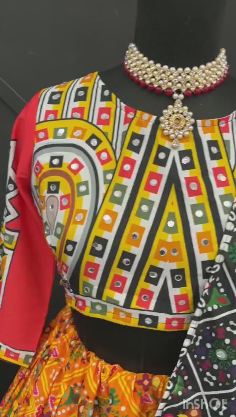 • Lehenga: Made from heavy Chinon silk with a captivating digital print and 4-meter flair. It comes semi-stitched with intricate real mirror work.