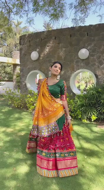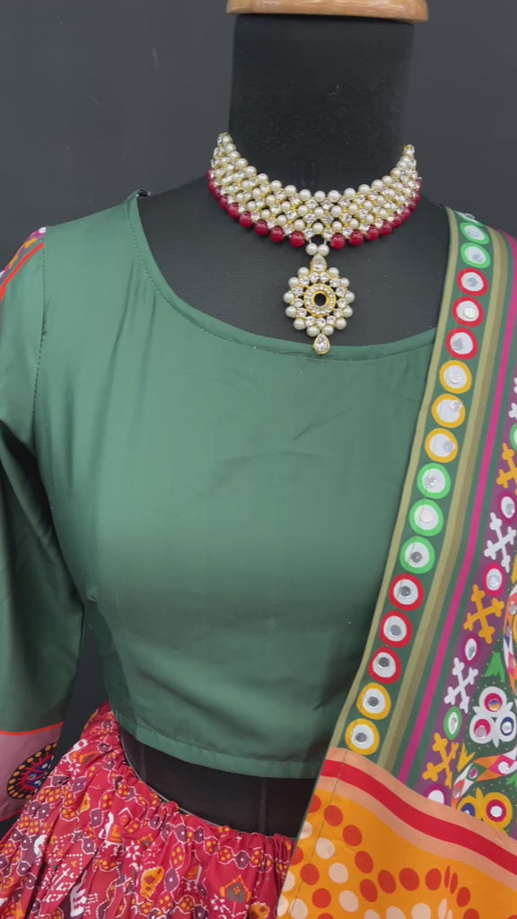 Red Green Lehenga Choli with Mirror work and attached Yellow Dupatta