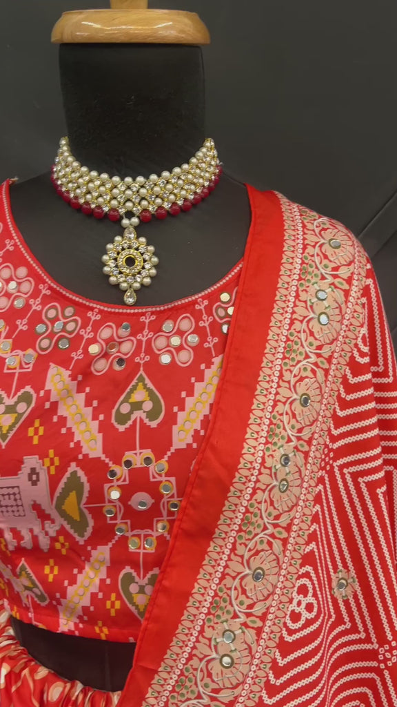 • Lehenga: Made from heavy Chinon silk with a captivating digital print and 4-meter flair. It comes semi-stitched with intricate real mirror work.