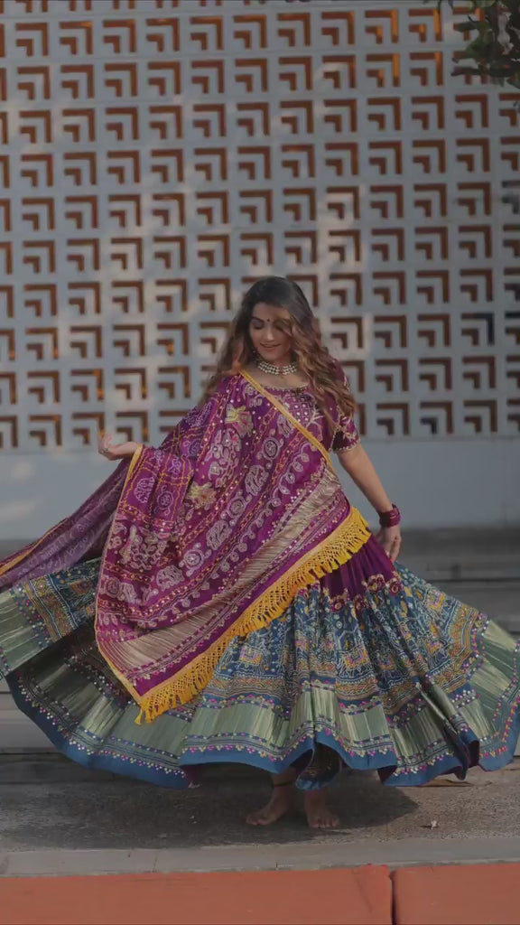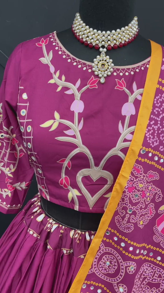 Discover the allure of our new designer printed lehenga choli, crafted from luxurious heavy butter silk and adorned with exquisite real mirror work. Perfect for any special occasion.